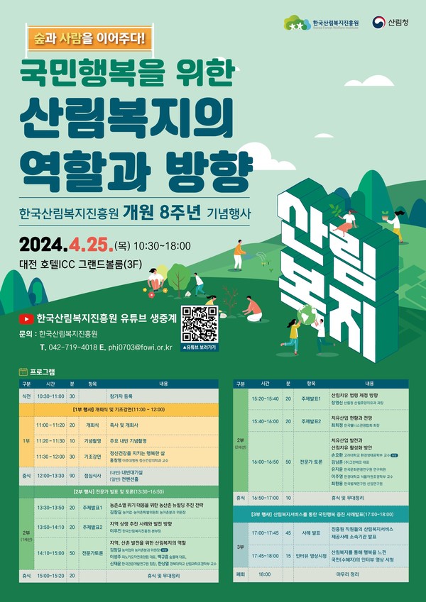 심포지엄은 온·오프라인으로 동시에 운영되며 온라인은 진흥원 유튜브 채널에서 생중계될 예정이다. 산림복지에 관심 있는 국민이면 누구나 참여할 수 있고 진흥원 누리집을 통해 접수 가능하다.