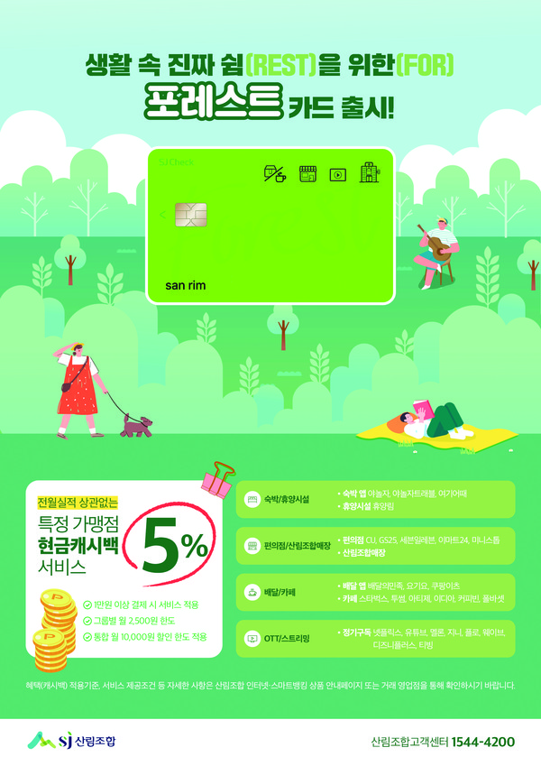 SJ산림조합금융은 최근 가맹점에서 1만 원 이상 결제하면 5% 캐시백을 받을 수 있는 ‘포레스트(Forest)’ 체크카드를 출시했다.