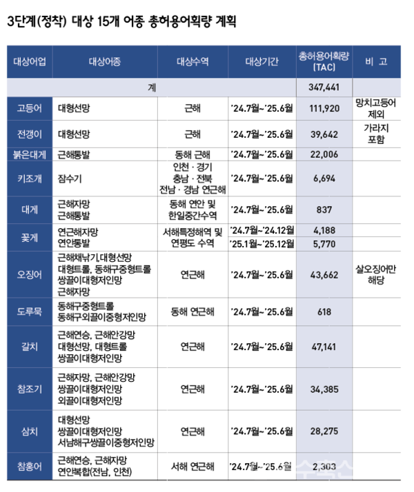 오는 7월부터 내년 6월 말까지 적용되는 15개 어종의 총허용어획량(TAC)이 34만7441톤으로 책정됐다.