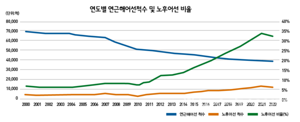 국내 연근해어선 10척 중 3척은 선령 21년 이상의 노후어선이다. 통계청 국가통계포털에 따르면 2000년 6만8629척이던 연근해어선은 2011년 4만9488척으로 줄어든 데 이어 2022년 3만9066척까지 줄었다. 같은 기간 선령 21년 이상인 노후어선의 척수는 4453척에서 1만2468척으로 3배에 육박하게 됐다.