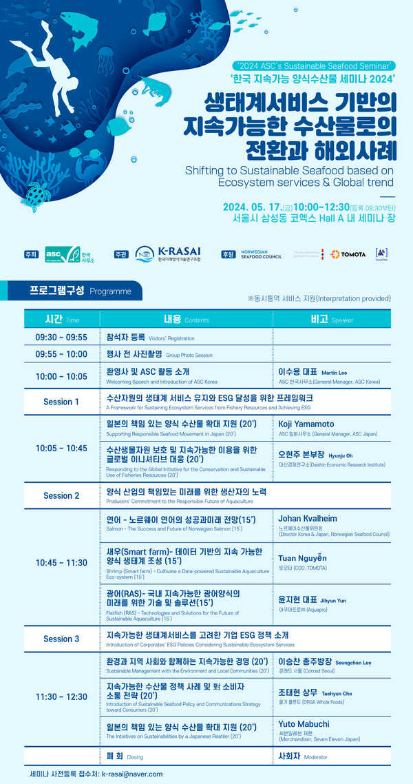 이번 세미나는 지역사회와 글로벌 양식환경 패러다임 재설정을 위해 생태계 서비스 기반의 지속가능 수산물의 전환 필요성을 주제로 열리며 ASC 해외 관계자뿐만 아니라 국내·외 유명 양식수산물 생산 및 유통업체가 참석해 다양한 사례를 공유할 예정이다. 세미나는 사전등록 우선으로 이뤄지며 동시통역서비스를 지원, 해외 연사들의 사례발표를 현장에서 생생하게 들을 수 있다.