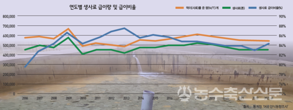 20년에 걸쳐 2000억 원 가량의 예산을 투입했지만 배합사료 사용비율은 여전히 제자리 걸음이다. 통계청 국가통계포털에 따르면 2006년 이후 배합사료 급이비율은 연도별로 편차는 있지만 대체로 15% 내외에서 형성됐고 지난해에는 15.59%를 기록했다. 20년 넘게 국민의 혈세 2000억 원을 투입한 결과치고는 초라한 성적표다.