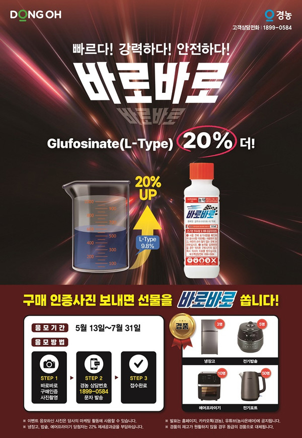 바로바로 인증사진 이벤트는 경농의 대표 비선택성 제초제 ‘바로바로’ 구매 인증 이벤트다. 바로바로를 구매한 뒤 인증사진을 경농 대표번호(1899-0584)로 문자 전송하면 된다.