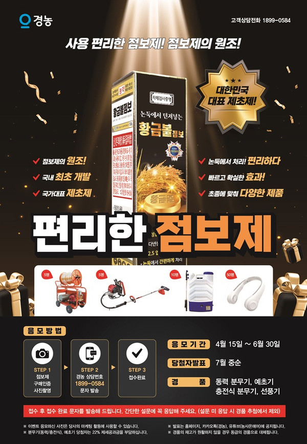지난 4월부터는 대규모 점보제 이벤트를 열고 있다. 경농의 점보제 제품과 함께 찍은 인증사진을 경농 대표번호로 문자 발송하면 추첨을 통해 농사의 필수품인 동력분무기와 예초기 등 푸짐한 선물을 증정한다. 응모 마감은 다음달 30일이며 당첨자는 7월 중순 발표 예정이다.
