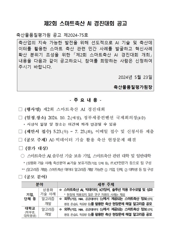 축산물품질평가원(이하 축평원)은 미래 축산 기술을 한눈에 볼 수 있는 ‘제2회 스마트축산 AI 경진대회’ 개최를 위해 현장 문제 해결형 상용화 기술, 알고리즘을 공모한다.