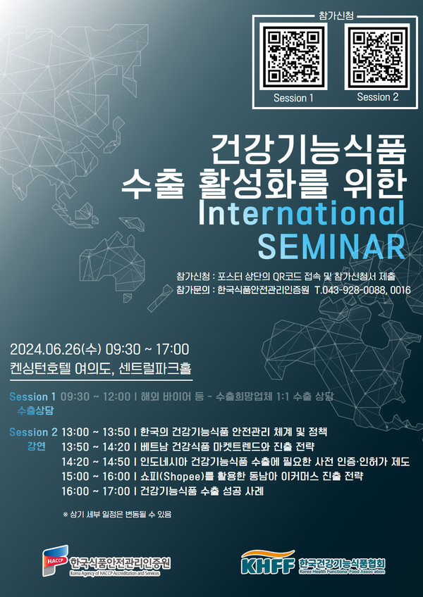 한국식품안전관리인증원(이하 해썹인증원)은 오는 26일 서울 켄싱턴호텔 여의도에서 ‘건강기능식품 수출 활성화를 위한 국제 세미나’를 개최한다.