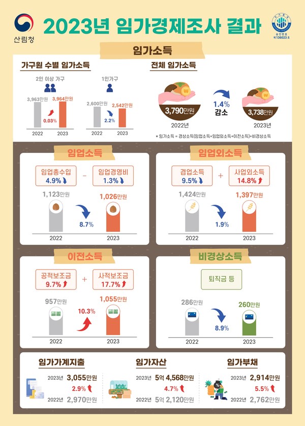 임업외소득과 비경상소득도 각각 1297만4000원, 260만 원으로 전년 보다 1.9%, 8.9% 감소했다.