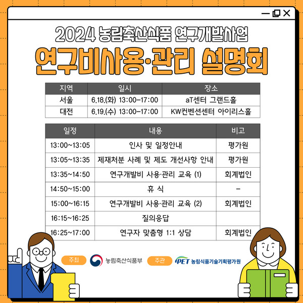 농림식품기술기획평가원은 오는 18일과 19일 양일간 각각 서울 aT센터와 대전 KW컨벤션에서 ‘2024년도 농림축산식품 연구개발사업 연구개발비 사용·관리 설명회’를 개최한다고 밝혔다.