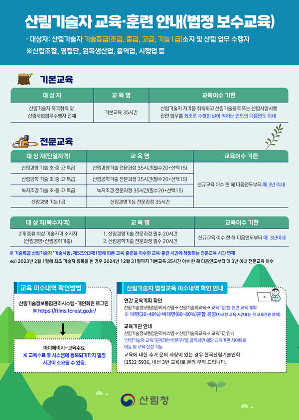기존 법규에 따르면 산림기술자 법정의무교육은 신규교육자인 경우 최초 업무수행일로부터 1년 이내, 보수교육은 이전 교육일로부터 3년 이내에 이수해야 했다. 하지만 산림작업 특성상 교육기관과 일터가 먼 거리에 위치해 있는데 반해 보수교육 기한은 일자기준 산정으로 기간이 짧아 교육시기를 놓치는 경우가 빈번히 발생해 한국산림기술인회 등 산림기술자들은 제도 개선을 요청해왔다.