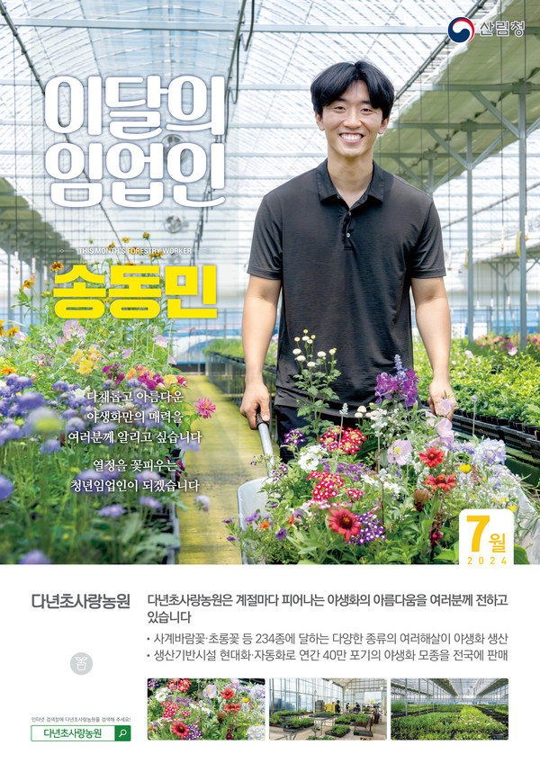 7월 이달의 임업인에 충남 금산에서 야생화를 재배하는 청년임업인 송동민 다년초사랑농원 대표가 선정됐다.