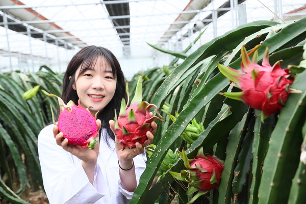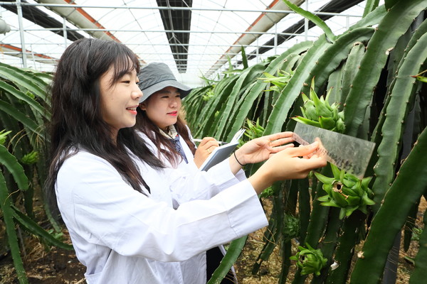 27일 제주특별자치도 제주시 북촌리 용과 재배 농가에서 농촌진흥청 국립원예특작과학원 연구진이 수확을 앞둔 용과의 생육 상황을 살펴보고 있다.