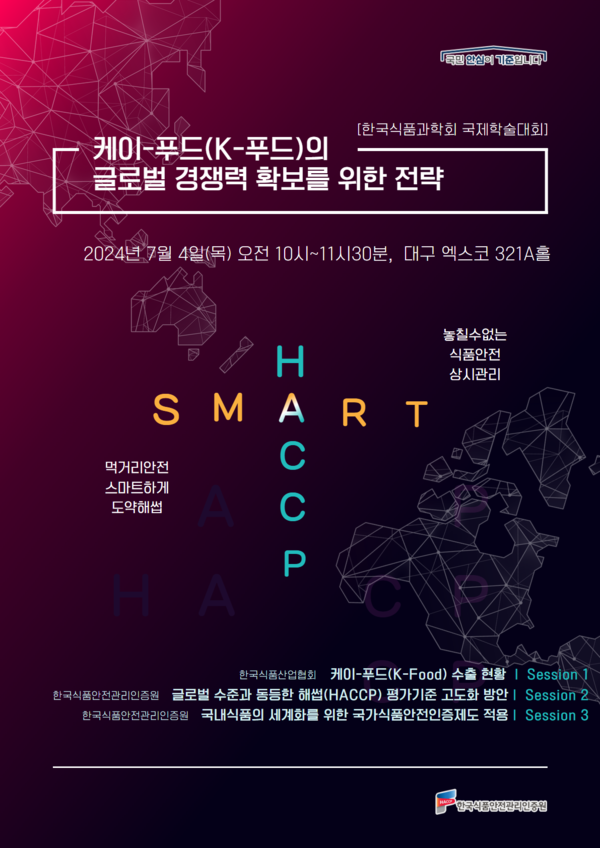 세션의 주요 내용은 △K-Food 수출 현황(심현수 한국식품산업협회 팀장) △글로벌 수준과 동등한 해썹(HACCP) 평가 기준 고도화 방안(구경민 해썹인증원 본부장) △국내 식품의 세계화를 위한 국가식품안전인증제도 적용(하용근 해썹인증원 팀장) 등이다. 세션의 좌장은 홍진환 해썹인증원 인증사업이사가 맡을 예정이다.