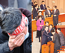 국회는 지난 16일 본회의를 열어 한·칠레 FTA 비준동의안을 표결에 부쳐 재석의원 271명중 찬성 162명, 반대 71명, 기권 1명으로 가결시켰다. 사진 오른쪽은 의원들이 투표를 하는 모습. 왼쪽은 한 농민이 국회통과소식을 듣고 낙담하고 있는 모습.