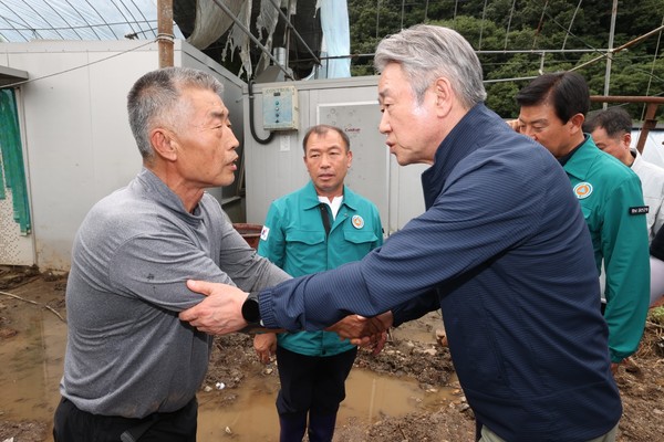 강호동 농협중앙회장은 지난 20일 집중호우로 큰 피해를 입은 충남 금산군과 전북 익산시 농가를 방문해 피해상황을 살피고 농업인을 위로했다.