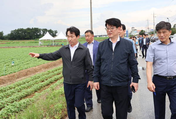 농촌진흥청은 지난 25일 전북 김제시 죽산면 논콩 생산단지를 방문해 생육 상황을 살피고, ‘무굴착 땅속 배수 기술’ 농가 시범지구를 찾아 집중호우에 대응한 배수 개선 효과를 점검했다.