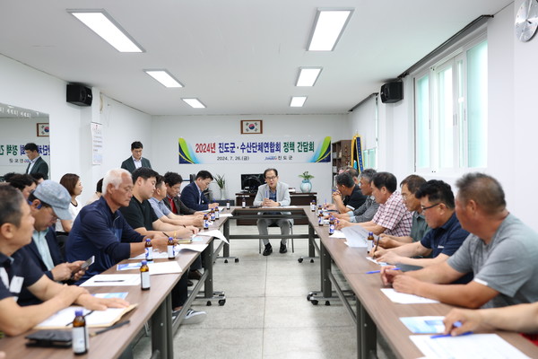진도군(군수 김희수)이 지난 26일 수산단체연합회 회의실에서 진도군수산단체연합회와 정책 간담회를 개최했다.