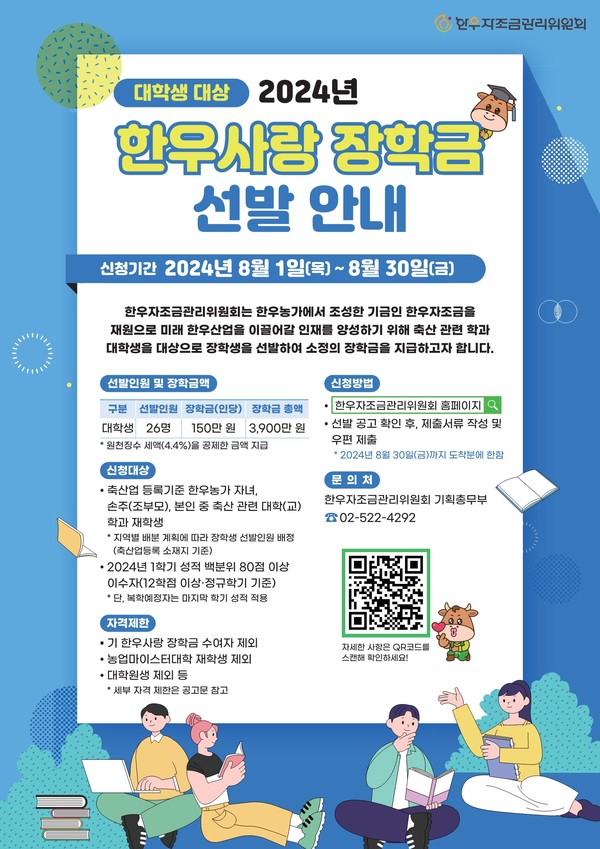 한우자조금관리위원회(위원장 이동활, 이하 한우자조금)가 한우산업의 미래를 이끌어갈 우수 인재를 양성하기 위해 한우사랑 장학생을 모집한다고 밝혔다.