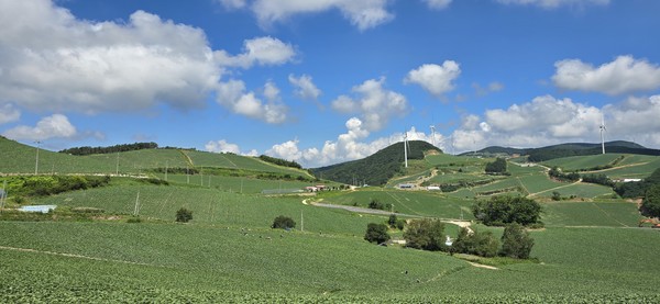 이례적인 긴 장마와 고온으로 병해충 확산이 우려되면서 요즈음 해발 1000m에 이르는 강원 강릉시 안반데기 배추밭에서는 방제와 잡초 뽑는 작업이 한창이다. 안반데기 지역의 배추는 오는 20일 즈음부터 출하돼 다음달 추석 시기까지 국민의 밥상을 책임진다. 사진은 강릉 안반데기 배추밭 모습.