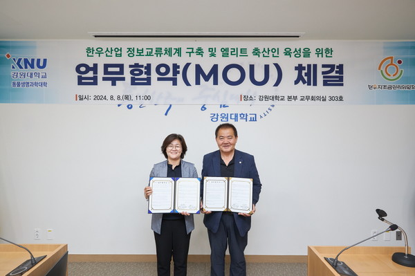 한우자조금관리위원회(위원장 이동활, 이하 한우자조금)는 지난 8일 강원대 동물생명과학대학(학장, 장애라)과 데이터 정보화 시대 급변하는 축산분야 환경변화에 대응하기 위해 한우정보 관련 유기적인 교류·협력 네트워크를 구성하고자 업무협력 협약을 체결했다.