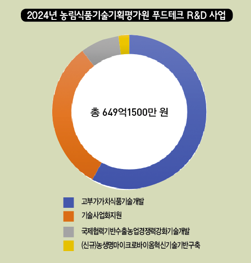 올해 농기평이 주관하는 푸드테크와 관련된 R&D 사업은 △고부가가치식품기술개발 △기술사업화지원 △국제협력기반 수출농업 경쟁력강화 기술개발 △농생명마이크로바이옴혁신기술기반구축이 있으며 네 사업의 올해 예산규모는 총 649억1500만 원에 달한다,