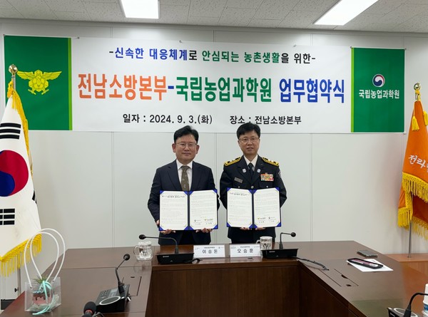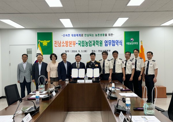 농촌진흥청 국립농업과학원은 전라남도소방본부와 지난 3일 전라남도소방본부 3층 회의실에서 ‘농작업 안전사고 신속 대응’ 관련 업무협약을 맺었다.