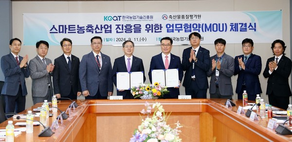 축산물품질평가원(원장 박병홍)은 스마트 농·축산업 보급 확산을 통한 국내 축산 정보통신기술(ICT) 기술경쟁력 강화와 지속 가능한 축산 구현을 위해 지난 11일 한국농업기술진흥원(원장 안호근)과 ‘스마트 농·축산업 보급 확산을 위한 업무협약’을 체결했다.