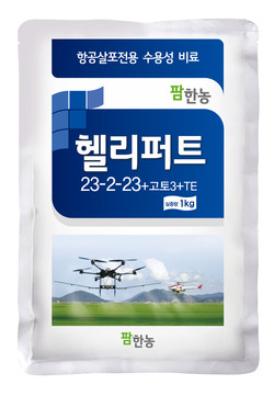 헬리퍼트는 노즐 막힘 없이 무인헬기, 드론으로 살포 가능한 항공살포 전용 생력화 비료다. 노동력을 절감할 수 있을 뿐만 아니라 벼 생육 후기에 필요한 칼륨 등의 영양분을 충분히 공급해 등숙률이 좋아지고, 고토를 함유해 미질 향상 효과도 거둘 수 있다.