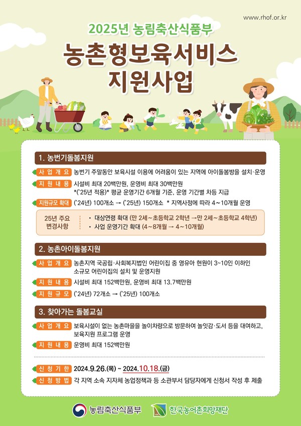 내년 농식품부 농촌형보육서비스 지원사업의 신청 기한은 오는 18일까지며, 신청은 각 지역 소속 지자체 농업정책과 등 소관부서 담당자에게 신청서를 작성·제출하면 된다. 그 밖의 문의사항은 희망재단 또는 지자체로 문의하면 된다.