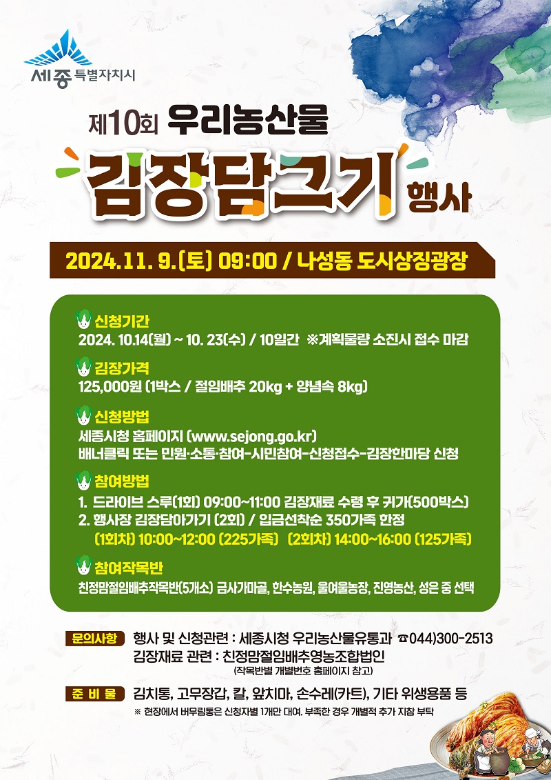 ‘10회 우리농산물 김장담그기’ 행사는 다음 달 9일 나성동 도시상징광장에서 열린다.