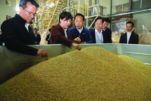 본격적인 벼 수확기를 맞아 전국적으로 올해산 벼 수매가 한창이다. 사진은 송미령 농림축산식품부 장관<가운데>이 지난 21일 충남 서산시 운산면에 소재한 산지유통업체인 동서산연합미곡처리장을 방문해 수확기 쌀 수급·수매상황을 점검하는 모습.