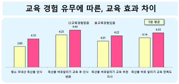교육 효과 조사에서도 동물성단백질 공급원으로서 축산물의 중요성 인지 4.18점, 국내산 축산물의 우수성에 대한 확신 4.08점 등에서 높은 점수를 기록했다.