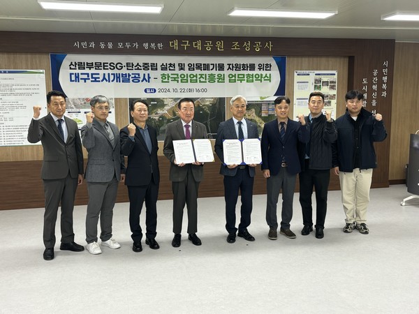 한국임업진흥원과 대구도시개발공사는 지난 22일 대구대공원 조성사업 현장에서 임목자원 활용을 위한 업무협약을 체결했다.