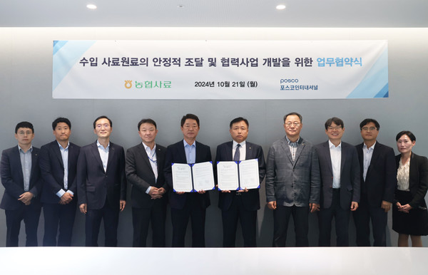 농협사료는 지난 21일 서울 강남구 포스코센터에서 김경수 농협사료 대표이사, 이상훈 포스코인터내셔널 식량바이오본부장 등이 참석한 가운데 ‘수입 사료원료의 안정적 확보를 위한 전략적 업무협약’(MOU)을 체결했다.