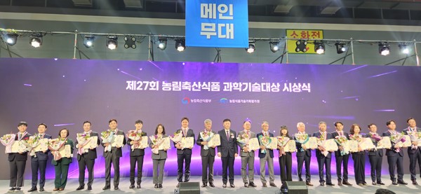 농림축산식품부는 지난달 28일 서울 양재동 소재 에이티(aT)센터에서 ‘제27회 농림축산식품 과학기술대상 시상식’을 개최했다. 농식품부는 1998년 ‘대한민국농업과학기술상’을 시작으로 매년 농림축산식품 분야의 우수기술 개발과 확산을 통해 농식품산업 발전에 기여한 연구자를 선정해 시상하고 있다.