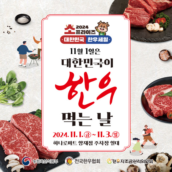 농림축산식품부(이하 농식품부)는 농협경제지주와 전국한우협회, 한우자조금 등과 협력해 오는 30일부터 다음달 8일까지 전국 대형마트, 농축협 하나로마트와 주요 온라인몰 등에서 대대적 한우 할인행사인 ‘소(牛)프라이즈 2024 대한민국 한우세일’을 실시한다.