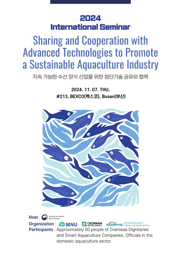 해양수산부가 주최하고 목포대, 전남대, 한국수산과학회가 주관하는 이번 세미나는 ‘지속가능한 수산양식산업을 위한 첨단기술 공유와 협력’을 주제로 국내외의 양식업 전문가와 산‧학‧연‧관 관계자 등 50명이 참석한 가운데 개최된다.