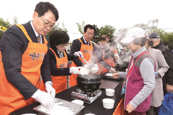지난 1일 서울 양재 하나로마트에서 진행된 ‘11월 1일 대한민국이 한우먹는날 기념행사’에서 김정욱 농림축산식품부 축산정책관(왼쪽부터), 허명 한국여성단체협의회장, 민경천 전국한우협회장이 시민들에게 한우곰탕을 나눠주고 있다.