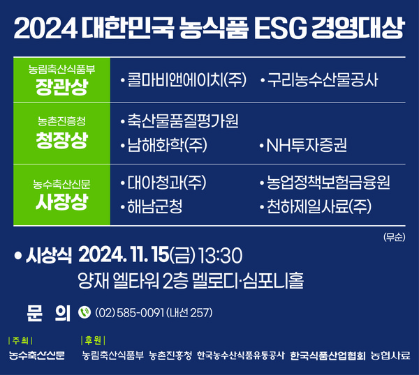한편 2024 대한민국 농식품 ESG 경영대상 시상식은 오는 15일 오후 1시 30분 서울 양재동 엘타워 멜로디·심포니홀에서 개최될 예정이다.