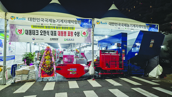 2024 키엠스타에서 농업기계화 공로를 인정받아 대통령표창의 영예를 안은 대동테크는 농식품신기술(NET) 인증을 받은 세계 최초 측창 부착식 TMR사료배합기 등을 대표적으로 선보였다.