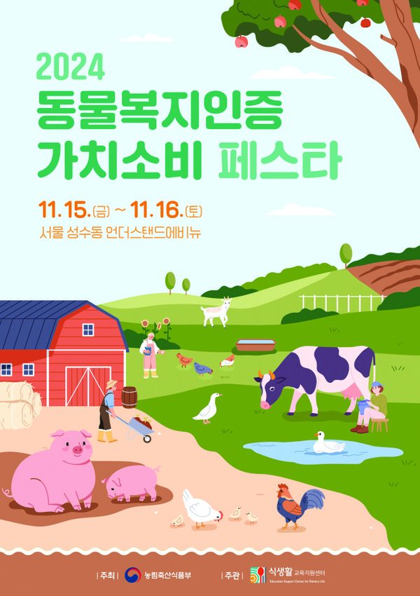 농림축산식품부(이하 농식품부)는 동물복지인증 축산물에 대한 국민들의 관심을 높이고자 15일부터 16일까지 ‘2024 동물복지인증 가치소비 페스타(이하 페스타)’를 서울 성수동 언더스탠드 에비뉴에서 개최한다.