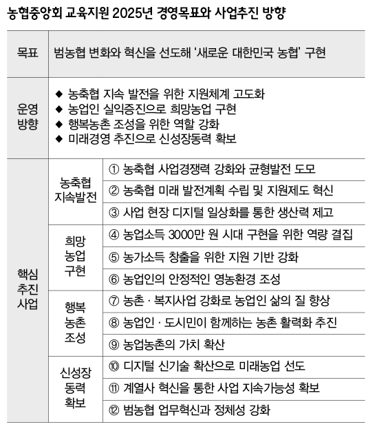 농협중앙회 교육지원 부문은 내년도에 ‘범농협의 변화와 혁신을 선도해 새로운 대한민국 농협 구현’을 목표로 농축협 지원을 강화해 농업소득 증대 등 농업인의 실익이 제고될 수 있도록 범농협의 변화를 이끌어낼 계획이다.