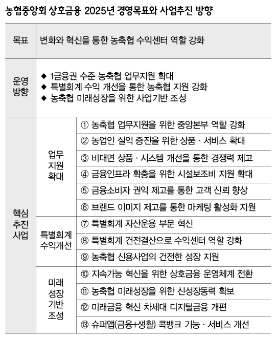 ‘변화와 혁신을 통한 농축협 수익센터 역할 강화’를 목표로 내세우는 농협중앙회 상호금융 부문은 △1금융권 수준 농축협 업무지원 확대 △특별회계 수익 개선을 통한 농축협 지원 강화 △농축협 미래성장을 위한 사업기반 조성을 운영방향으로 설정했다.