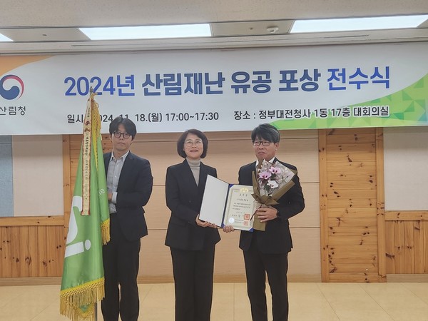 한국임업진흥원이 소나무재선충병을 비롯한 산림병해충 저지를 통해 산림보호에 앞장선 공헌을 인정받아 지난 18일 대통령 표창을 수상했다.