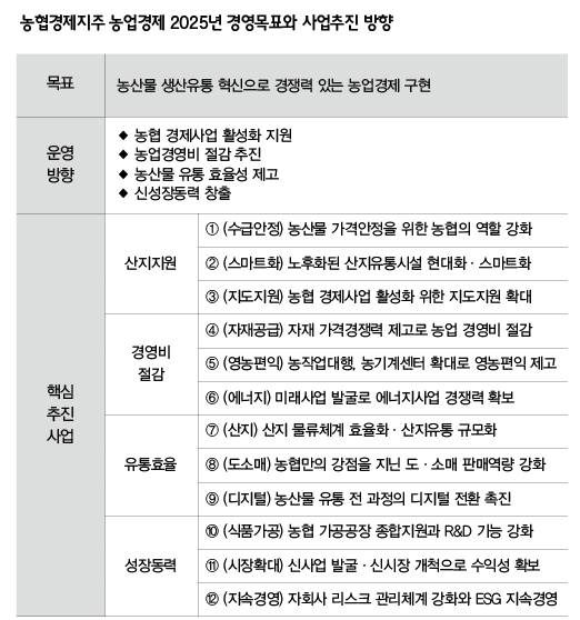 농업경제는 산지 농산물의 수급과 가격 안정, 농업생산비 절감, 농산물 유통체계 개선을 주된 과제로 설정했다. 축산경제 역시 유통 혁신을 통한 안정적인 농가소득을 경영목표로 설정해 추진한다는 계획이다.