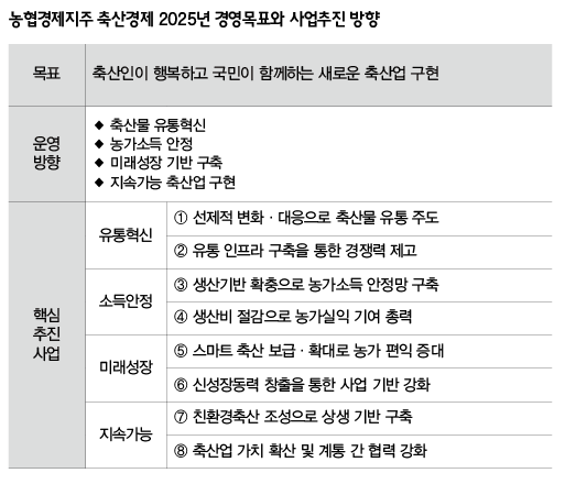 이를 위해 축산물 유통혁신, 농가소득 안정, 미래성장 기반 구축, 지속가능 축산업 구현을 사업추진 방향으로 정하고 △선제적 변화·대응으로 축산물 유통 주도 △유통 인프라 구축을 통한 경쟁력 제고 △생산기반 확충으로 농가소득 안전망 구축 △생산비 절감으로 농가 실익 기여 총력 △스마트축산 보급 확대로 농가 편익 증대 △신성장동력 창출을 통한 사업 기반 강화 △축산업 가치 확산과 계통 간 협력 강화 등을 추진할 계획이다.