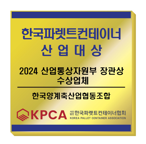한국양계농협(조합장 정성진)은 지난 18일 서울시 중구 대한상공회의소에서 열린 ‘제21회 한국파렛트·컨테이너산업대상’ 시상식에서 유닛로드시스템(ULS) 컨테이너부문 대상인 산업통상자원부 장관표창을 받았다고 밝혔다.