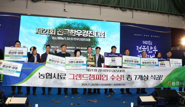 농협사료를 이용하는 농가들이 지난 26일 농림축산식품부 주최, 농협경제지주 축산경제 주관으로 안섬팜랜드 종합행사장에서 열린 제 21회 전국한우경진대회에서 대통령상인 그랜드챔피언을 비롯해 총 7개상을 휩쓸었다.