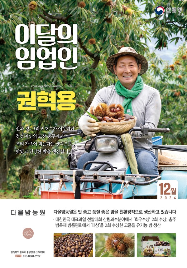 산림청이 선정하는 12월 ‘이달의 임업인’으로 충북 충주에서 친환경 밤을 재배하는 권혁용 다올밤농원 대표가 선정됐다.