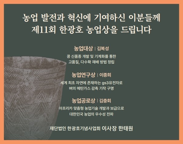 한편 제11회 한광호 농업상 시상식은 내년 1월 23일에 개최될 예정이다.