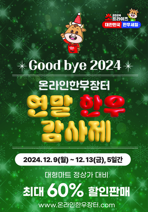 한우자조금관리위원회(위원장 이동활)는 지난 9일부터 오는 13일까지 5일간 ‘2024 연말 온라인 한우장터’를 개최한다고 밝혔다.